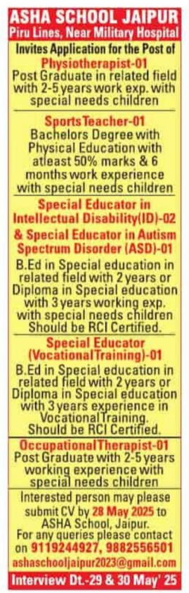 Asha School Jaipur, located at Piru Lines, Near Military Hospital, invites applications from qualified professionals for various teaching and therapist positions for the 2025 academic year. These roles are ideal for individuals passionate about working with special needs children.