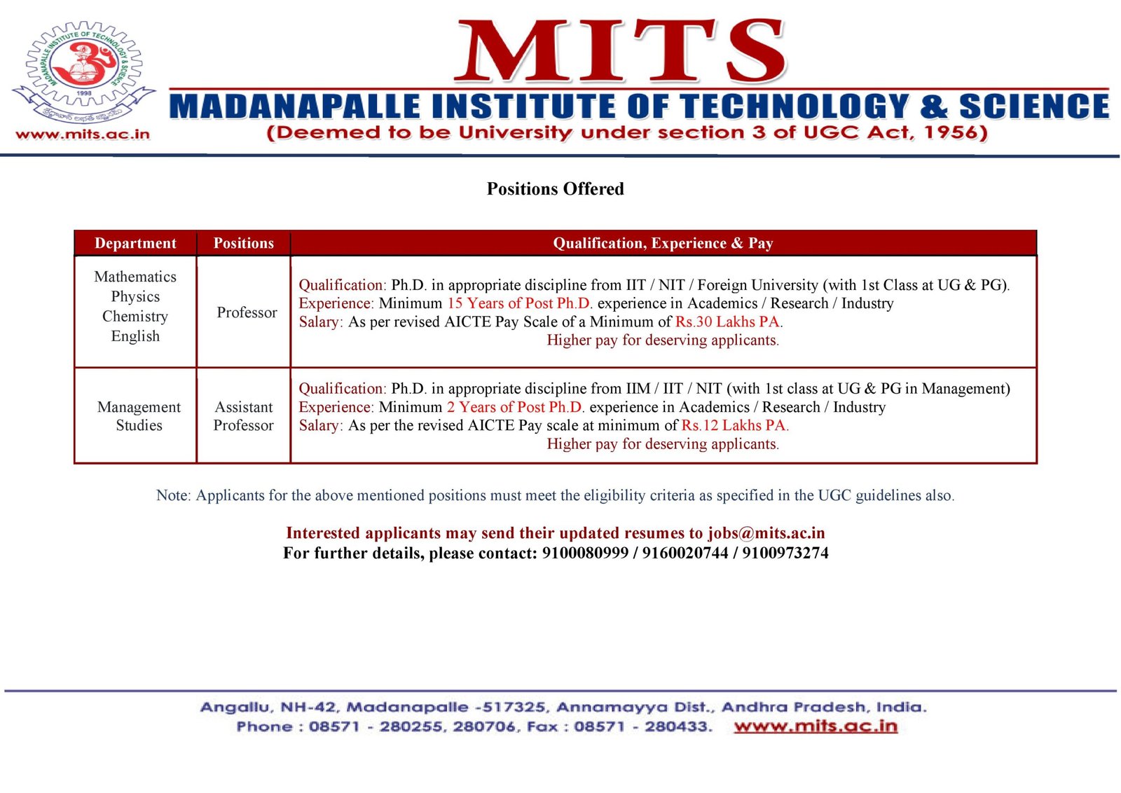 MITS offers an attractive salary package for faculty jobs in Madanapalle as per revised AICTE norms. Senior Professor positions offer premium compensation packages.