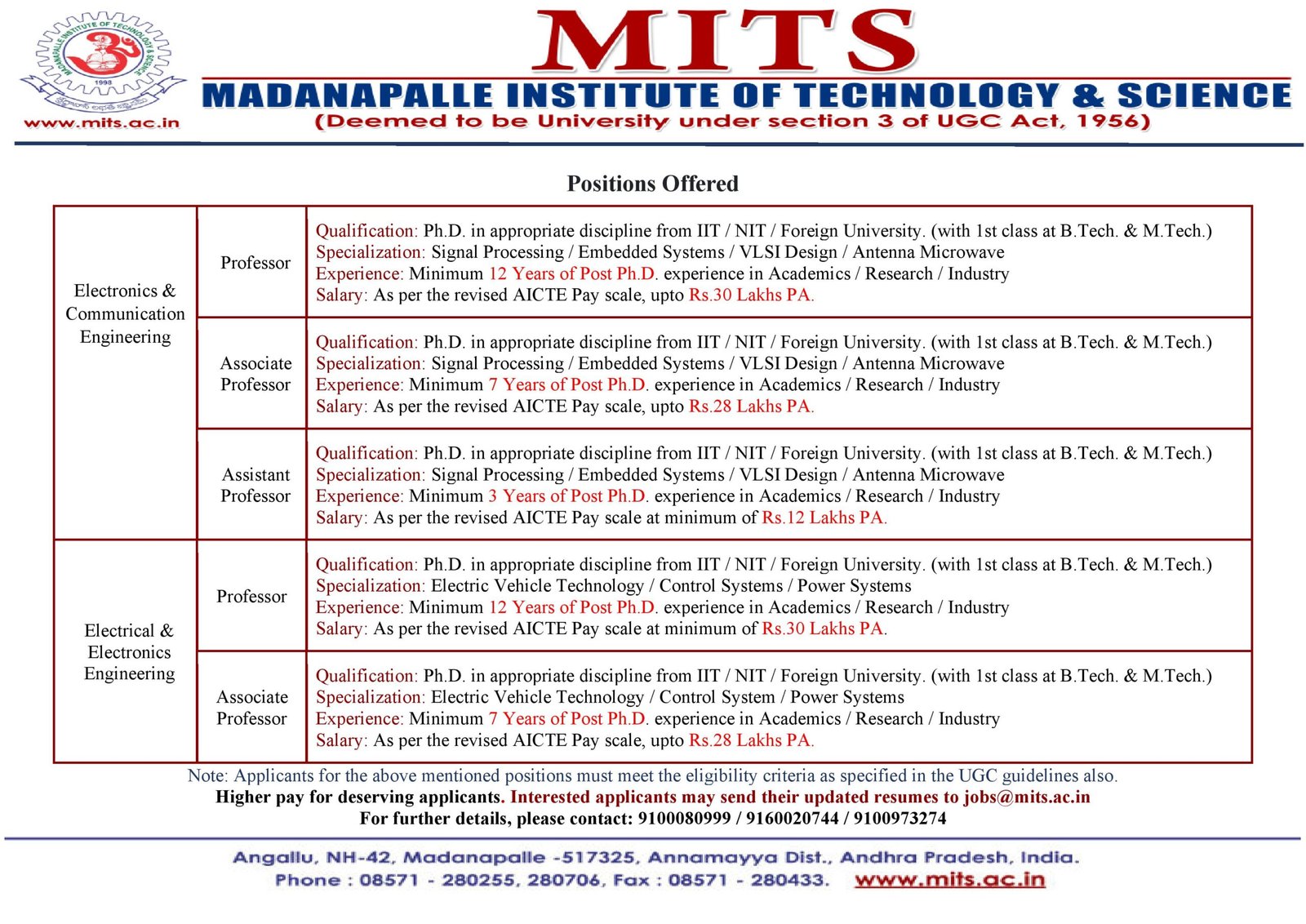 Madanapalle Institute of Technology and Science (MITS), one of the reputed private engineering institutions in the region, has announced multiple vacancies for the upcoming academic year. Applications are invited from highly qualified and experienced candidates for Professor, Associate Professor, Assistant Professor, and Lab Assistant positions in various engineering disciplines. This recruitment drive is ideal for professionals seeking rewarding careers in academics, research, laboratory operations, and institutional development. Candidates with excellent academic records, Ph.D. qualifications, and relevant teaching or industry experience are encouraged to apply. If you are searching for teaching jobs or non-teaching jobs in Andhra Pradesh, this is a strong opportunity to join a prestigious campus environment.