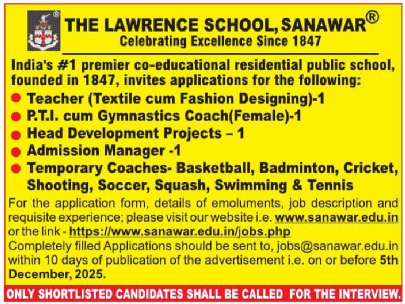 The Lawrence School, Sanawar, one of India’s premier and oldest co-educational residential public schools established in 1847, has announced multiple vacancies for the upcoming recruitment cycle. Renowned for academic excellence, holistic education and world-class sports facilities, the institution invites qualified professionals to join its distinguished educational community. The school is now hiring for Teachers, Coaches, Project Head, Physical Training Instructor, and Admission Management positions.